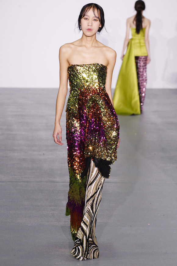 但这还不是整场秀让人印象最深的记忆点。整场秀的最大亮点在于,设计师用裤装与各种各样的裙子进行了搭配。Jackie Lee表示,做出这样的设计是为了传达这一季的主题,与使用鲜艳、饱和度高的颜色目的一样,都是为了庆祝女性权力和独立性的显著提升。事实上,以裤装打底,模特与此同时还穿着A字裙、伞裙,甚至是风衣式连衣裙,设计师想表达的思想早已经表露无遗了。
