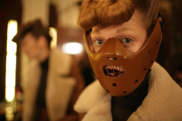 整场秀,你会看到一整队表情严肃的“女精英”气势十足地轮番朝你走来。她们无一例外抹着暗紫色的口红,而在穿戴上,有的戴着黑手套,提着公文箱,有的穿着大垫肩的外套,有的穿着棱角锐利的裙子,也有人索性“头顶光环”、或在上半脸和下半脸分别戴上人脸同款或是皮质封嘴的面具。
