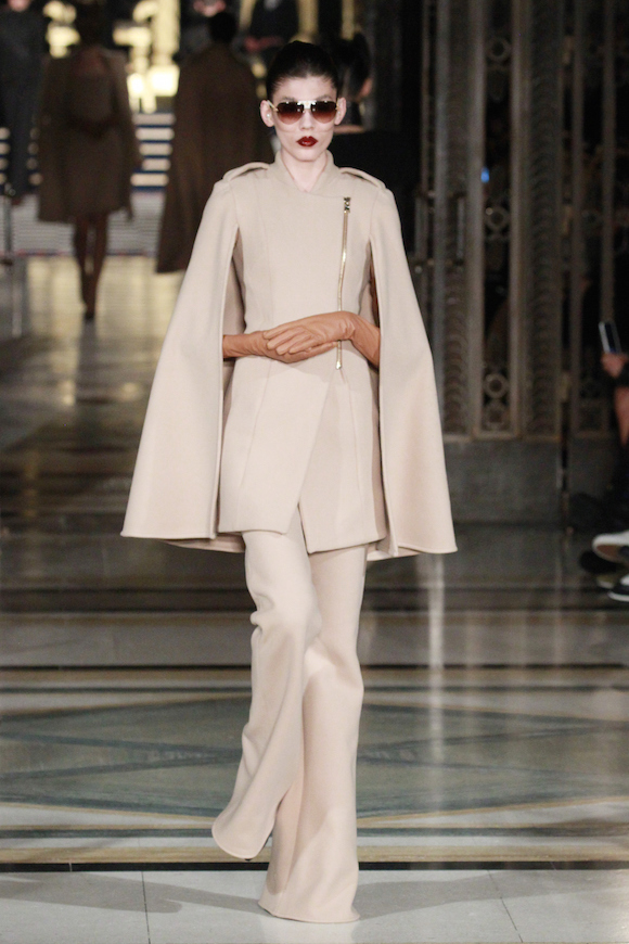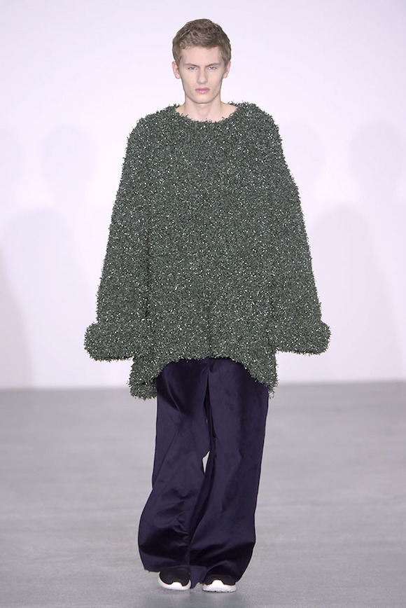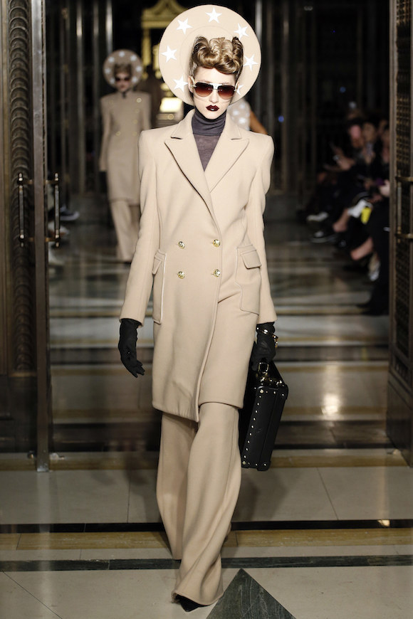 如果看到这里还觉得主题不够明确,Pugh在秀的最后找来了两位男模陪同一位穿着绒面超大垫肩大衣的女模霸气巡场,而她们行进时的背景声配的是“I’m a man-eating machine.(我是一个吃男人的机器。)”