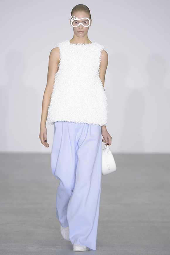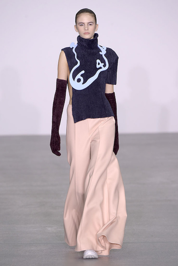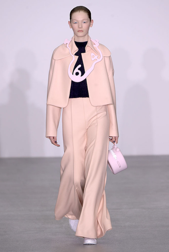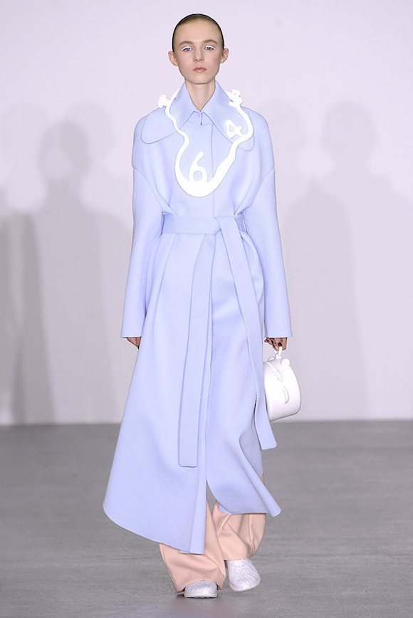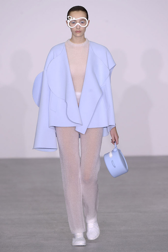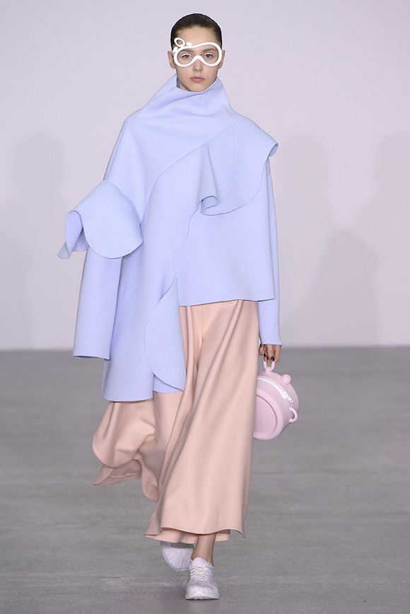 所以,以“时间”为题,Xiao Li 将钟表里的机械结构,用针织手法做出的类塑料质感的装饰物缝在了衣服上,戴在了模特的眼睛和脖子上。同时,模特的手包也是一个小闹钟的形状,直接点题。而也许为了营造一种慢下来的感觉,在秀的开始阶段,Xiao Li 多采用了饱和度不高的粉色、蓝色以及白色。直到后半段,藏青、酒红、墨绿和黑色这样的重颜色才大规模出现。