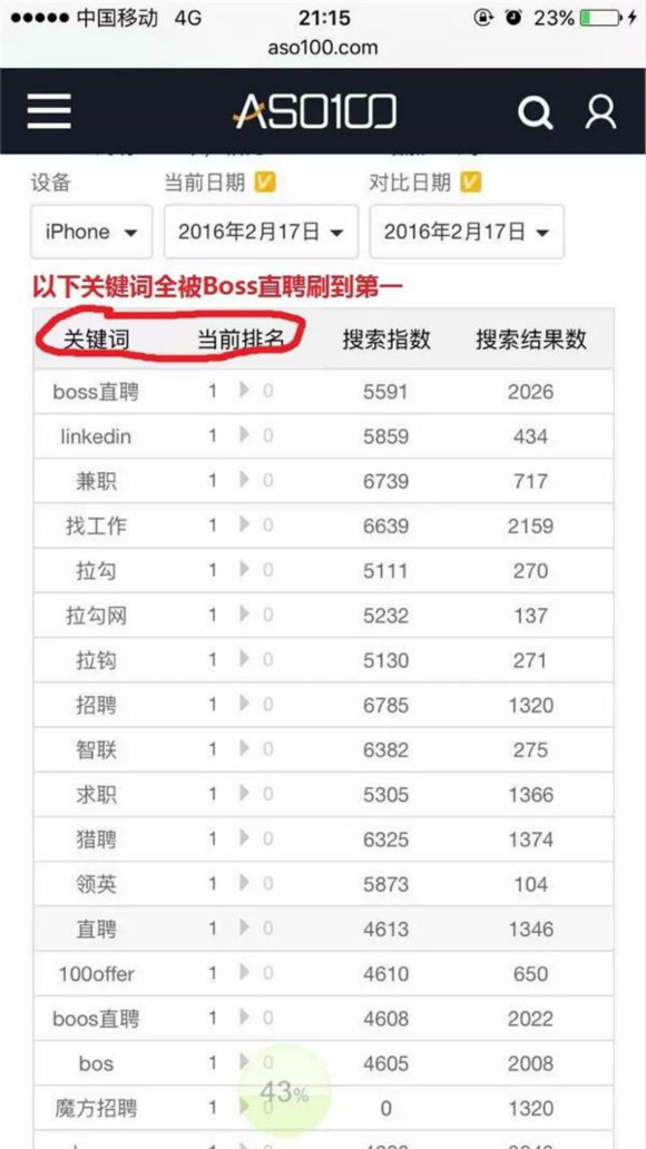 除在用词方面指出拉勾声明中存在的一些漏洞外,Boss直聘也像拉勾一样反咬拉勾网恶意刷榜,指出同一家ASO监测机构的数据显示,拉勾的小马甲“Boss在线招聘”正在疯狂抢占所有招聘相关的关键词。“Boss在线招聘”在2016年1月29日首次上架,仅仅21天就抢占了中华英才、智联招聘、CSDN等众多老牌招聘服务的关键词,甚至还包括知乎这样的问答社区网站。
