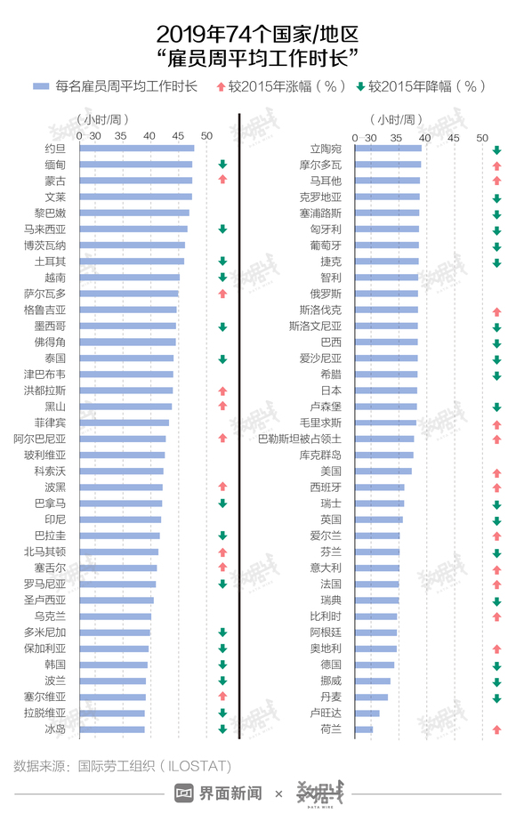 对比2015年,韩国、英国等至少33个国家/地区“上班族”2019年周平均工作时长在下降。