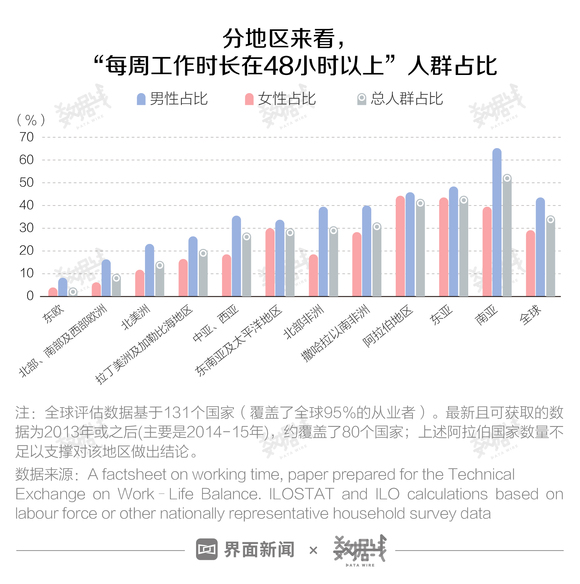那么,全球范围内,“过劳”真的有所缓解吗?据国际劳工组织发表于2018年一份研究论文《Working Time and The Future of Work》,全球约有36.1%的劳动力每周工作超48小时。其中,南亚男性占比最多,达到60%以上,远超其他地区。