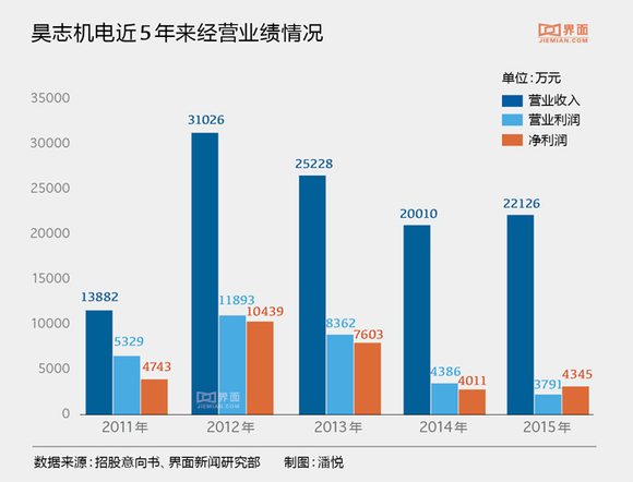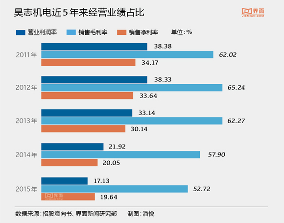 数据显示,2011年至2015年,昊志机电的营业利润率、销售净利率、销售毛利率三项指标均有明显下降的趋势。截至到2015年,这三项指标分别为17.13%、19.64%、52.72%。