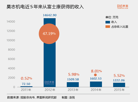 招股意向书披露的信息显示,2013年至2015年,公司前五名的主要客户包括台湾大量、富士康、远洋恒大、大宇精雕等。结合公司在2014年发布的招股说明书,可见富士康的地位不容小觑,以至于公司在2014年的这份招股说明书中单独罗列出“富士康设备采购的阶段性特点所带来的业绩波动风险”。事实证明,这个风险是巨大的。