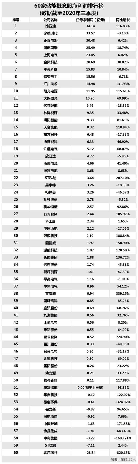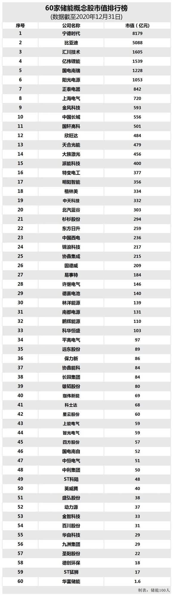 “储能100人”从A股市场筛选出了最新的60家储能概念股,对其市值、营收和利润做了最新的排名,
