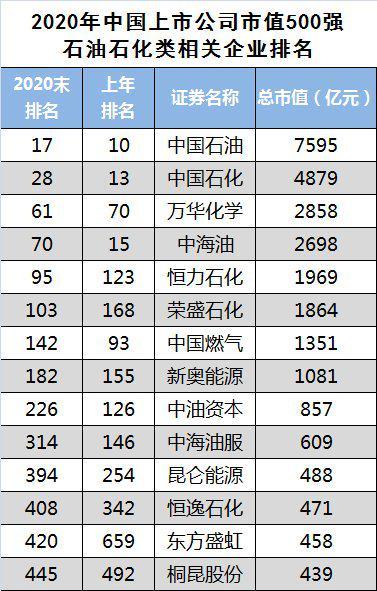 2020年末,中国石油以7595亿元的总市值,位居石油、石化类相关企业榜首、全国500强排名第17。
