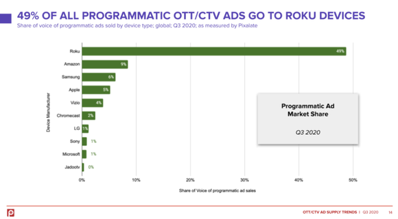 Pixalate最近报告显示,第三季度,Roku设备占据了智能电视节目广告投放总量的49%。