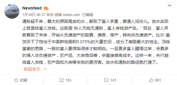 顶级富豪的思路,一般的富人要滞后很多才能明白。一旦更多富人醒悟过来,会更多涌入非负债资产,农产品、大宗商品等,直接推高成本。这样一来,央行越给富人发钱,农产品和大宗等会涨得更厉害,放水和通胀的路径就打通了。”