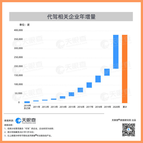 天眼查专业版数据显示,我国2020年共新增超过18万家代驾相关企业(全部企业状态),较去年同比增长388%。