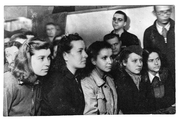 一群年轻人站在门前,第一次见到了他们接下来要居住的集中营。大门上方是用铁浇铸的装饰,上面写着集中营的口号:“劳动带来自由。”