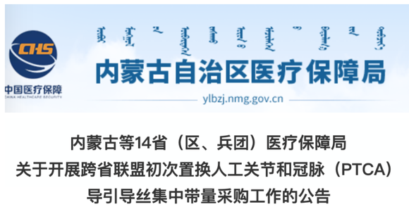 今日(1月26日),内蒙古医保局发布《内蒙古等14省(区、兵团)医疗保障局关于开展跨省联盟初次置换人工关节和冠脉(PTCA)导引导丝集中带量采购工作的公告》,史上最大体量地方性耗材集采联盟横空现世!