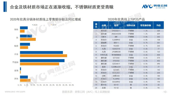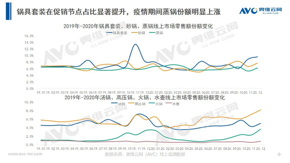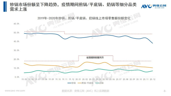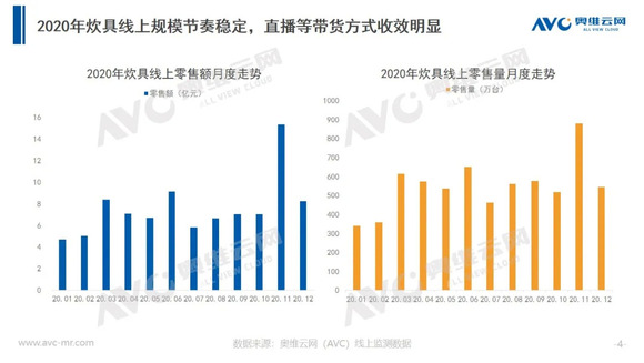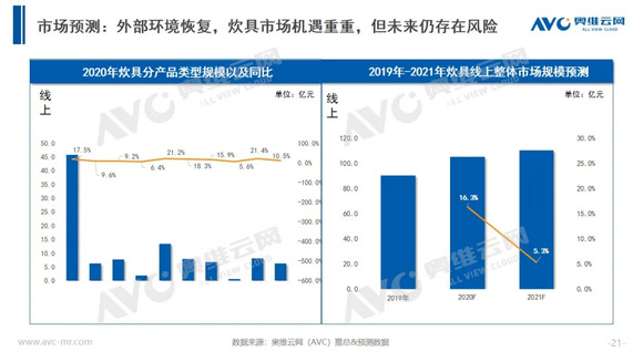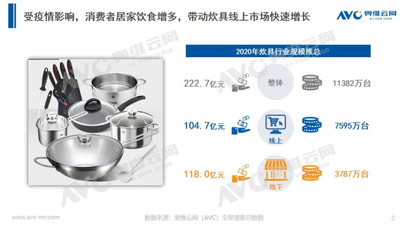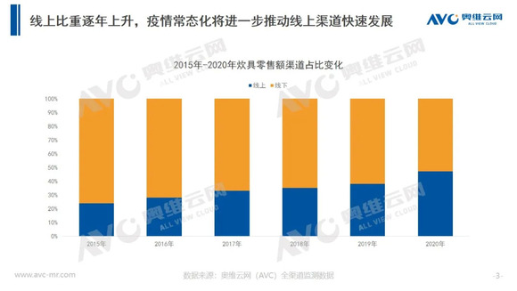 2020年突如其来的疫情令更多的国人意识到家中厨房的重要性,各品类刚需炊具产品表现亮眼。据奥维云网(AVC)线上推总数据显示,2020年线上炊具市场零售额为104.7亿元,同比增长16.3%。随着疫情的常态化发展,以线下为主的炊具市场逐渐向线上渠道转移,预计2021年线上渠道零售额占比将可能突破50%。