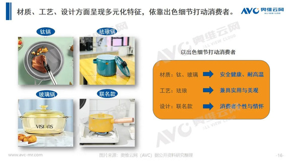 产品方面,各个品牌陆续推出深受年轻消费者群体喜爱的潮流外观产品,“国潮风”、“联名款”等主题逐渐打破传统炊具的壁垒;材质方面,随着消费者对健康关注度的不断提升,高等级不锈钢、铸铁等材质更加受到青睐,传统的铁质及合金材料零售额占比不断下降;工艺方面,珐琅锅、玻璃锅等新兴工艺炊具快速占领市场。