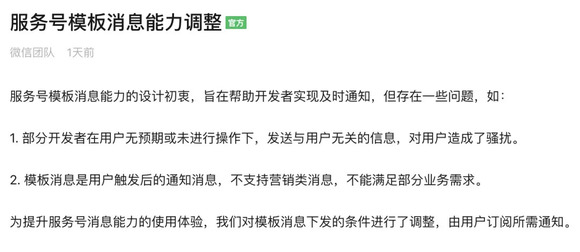 所谓物极必反,盛极必衰。随着微信平台影响力的扩大,越来越多的开发者加入到了微信生态中试图分一杯羹,这其中不乏头脑发热,游走在规则边缘的极端分子,即便是强如微信这样的国民级平台,也不可能做到 100% 监管到位,无端骚扰用户甚至侵害用户人身财产安全的事件日益增多。近两年微信团队也多次就服务号违规运营和模板消息能力的权限问题做出了整改和调整,但这些调整所带来的影响远没有 1 月 27 日的公告来的迅猛且深远。