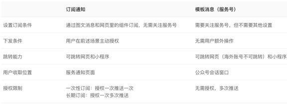 据公告描述,新的订阅通知包括“一次性订阅”和“长期订阅”,测试阶段订阅通知和模板消息接口将共存运行,原模板消息使用不受影响(之前未开通此功能的账号将无法新增),收到公告后黑板洞察第一时间进行了测试,具体接口能力和权限变化大家可以看下面这张图。