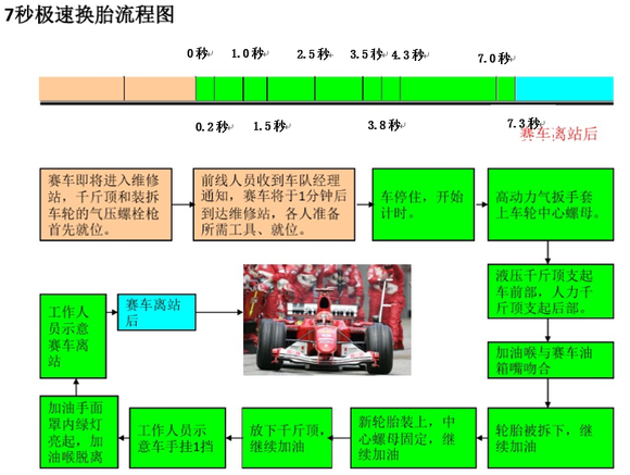 众所周知,F1赛车维修站进出站周转速度数以秒计。据统计,F1赛车极速换胎和加油只需7秒钟。这7秒钟内的换胎和加油究竟是如何完成的?