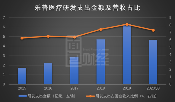 从2015年以来的研发投入情况来看,乐普医疗2018年开始大幅增加研发支出,正好是药品带量采购实施的第一年。公司研发投入占营业收入的比例也在2018年开始明显回升,2019年上升至8.09%。2020年前三季度,乐普医疗的研发支出金额为4.66亿元,同比增长30.59%,明显高于同期的营收增速。