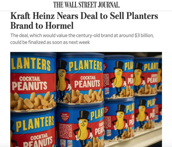 今天,华尔街日报引述知情人士消息称,卡夫亨氏即将达成一项出售交易,拟将旗下的美国绅士(Planters)坚果零食业务出售给荷美尔食品公司(Hormel Foods Corp.),价格约30亿美元(约合人民币193.77亿元)。知情人士说,如果谈判顺利,该交易可能会在下周宣布。