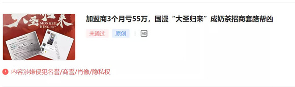 在历时20天的调查中,我们与多位类似情况的加盟商做了沟通,感觉到“大圣茶”品牌方在经营过程中确实存在的一些问题,于是撰写并发布了一篇标题为《加盟商3个月亏55万,国漫“大圣归来”成奶茶招商套路帮凶》的稿件。