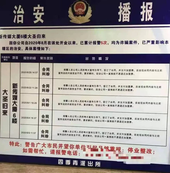 “新传媒大厦6楼大圣归来,因你公司自2020年8月在该处开业以来,已累计报警5次,均为诈骗案件,已严重影响本辖区的治安……四季青派出所。”