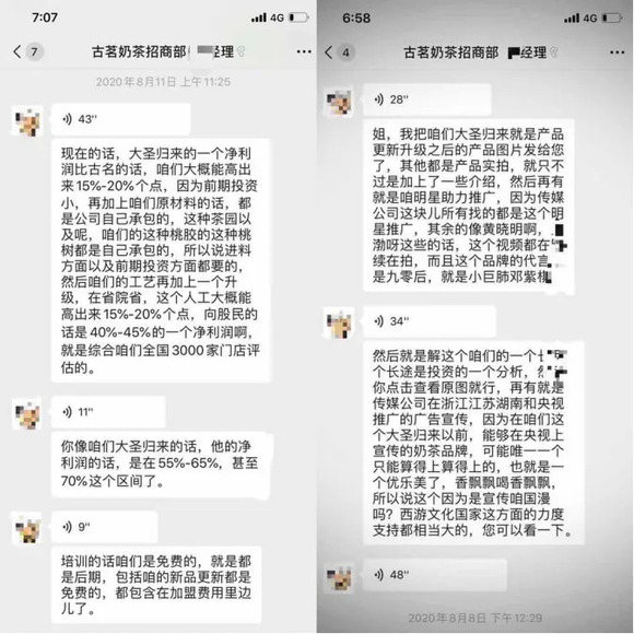 随后就和探案报道过其他加盟入坑的流程一模一样:百度搜古茗填联系方式,自称古茗的招商经理找过来说“大圣茶是古茗的升级品牌”,此后,张青在8月去杭州参加了招商会。