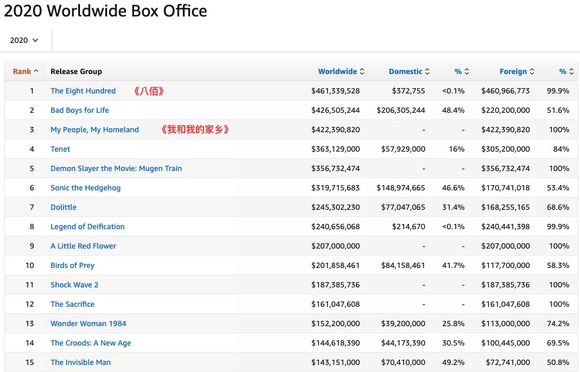 根据box office数据,2020年中国内地市场以全年票房31.2亿美元超越北美的22.8亿美元,进入登上全球票房前五十名单的中国电影共有13部,其中《八佰》和《我和我的家乡》两部票房均超4亿美元,《八佰》更是全球年冠。