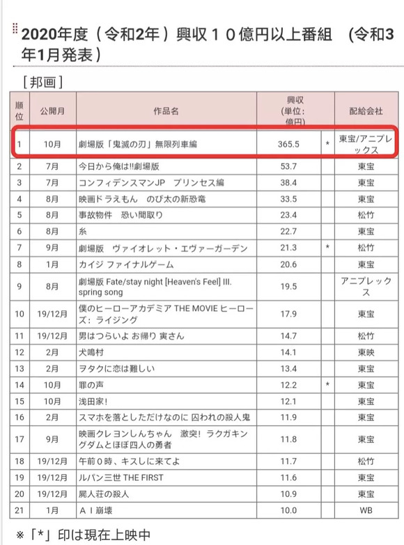 去年10月上映后,《鬼灭之刃:无限列车》票房一路飙升,最终超过《千与千寻》登顶日本影史票房冠军。根据去年12月底的数据,该片以3.22亿美元占据了日本全年票房的22%。而影片今年还在持续上映,票房还在继续增长。