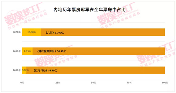 2020年中国内地全年票房204亿,其中年度票房冠军《八佰》以31.09亿的票房占据了全年总票房的15%,超出往年。2019年票房50亿的《哪吒魔童降世》和2018年票房36亿的《红海行动》各自仅占当年总票房的7.85%和6.02%。