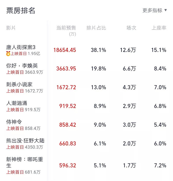 但“神仙打架”也有输赢。截至2月5日的数据,预售超2亿的《唐人街探案3》目前独占首日38%的排片量,以至于预售排在四五位的《人潮汹涌》《侍神令》上映首日的排片量不到10%。
