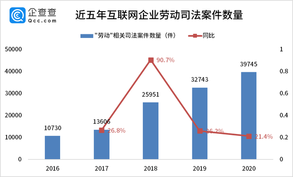 五年间,互联网企业劳动相关司法案件从每年1万多件增长到每年近4万件,翻了两番。
