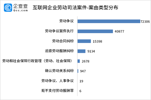 从互联网企业发生的劳动司法案件类型来看,企查查数据显示,劳动争议案件占比过半,达到7.23万件;其次是劳动争议案件执行,达到4.09万件。也就是说,互联网企业的劳动司法案件中,劳动争议相关案件占比高达80%以上。此外,劳动合同纠纷、追索劳动报酬纠纷、劳动关系纠纷的案件数量也较多。