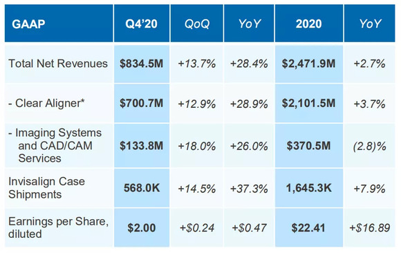 在疫情全面冲击临床医疗的背景下,牙科企业业绩普遍下滑,而Align Technology(隐适美)却在整个牙科赛道逆袭,2020年Q3 Q4营收仍然达到21%和28%的双位数增长。
