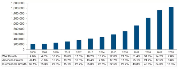 自2001年登录纳斯达克,近十多年Align Technology的股价上涨超过16.7倍,约89%的营收由隐适美贡献;截止2019年其总回报率达1393%,被华尔街誉为“过去10年表现比亚马逊和谷歌更好的股票”。
