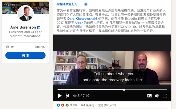 从苏安励的社交平台分享上看,三周前的在家治病休息期间,他仍在网上进行关于旅行市场复苏的讨论。他通过视频采访了Uber的CEO,询问其怎么度过疫情艰难期,以及关于旅游出行什么时候会恢复的看法。