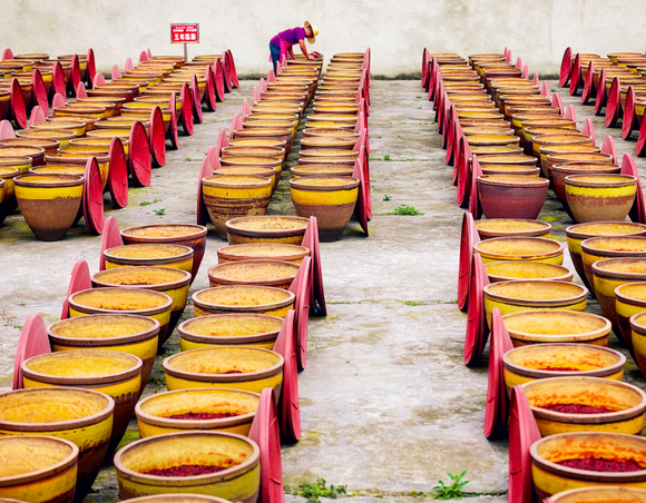 很多当地菜都会用到辣椒,但总是创意无限,所以从不乏味。干海椒过油炸得焦香,提炼出煳辣味,成为著名的宫保鸡丁与无数炒菜的底味;而在味道特别热烈的麻辣菜中,辣椒与花椒成为“调味双雄”。海椒面和红油则用在五花八门的凉菜中,最著名的是怪味,综合了咸、甜、麻、辣、酸和果仁味儿;而豆瓣酱则是家常菜中当之无愧的霸主。辣椒的火爆从不为盖住其他食材的风味,而是想要唤醒感官,打开味蕾,让人感受更为丰富的滋味。四川豆瓣酱是成都郫都区(旧称郫县)的著名特产。用料在中国来说很特别,不是黄豆,而是胡豆。胡豆与小麦粉混合,自然长出霉菌,放在盐水中发酵,然后和盐水泡椒混合搅匀。传统的做法中,酱料应该放在不密封的陶罐中慢慢熟成:阳光灿烂的白天,接受太阳的烘烤;晴朗清新的晚上,让露水来滋润;只有在下雨的时候,才把罐子盖上。据说,通过这种特殊的过程,酱料会吸收天地精华,将土地的灵气吐纳自如。