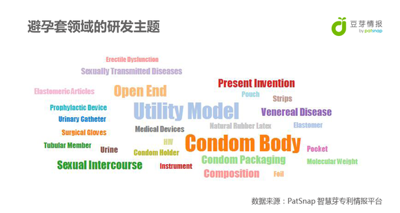 下图则是从与避孕套相关专利的标题和摘要中提取的关键词,可以了解与避孕套相关的研发主题。