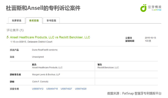 Ansell向联邦法院控告Reckitt Benckiser公司在2013年生产的RealFeel安全套严重侵犯该公司专利权。以下是在智慧芽专利数据库中搜到牵涉到此次案件的专利:US20090272384A1和US8087412,下图则是此次专利诉讼案的的诉讼信息。