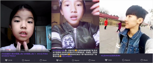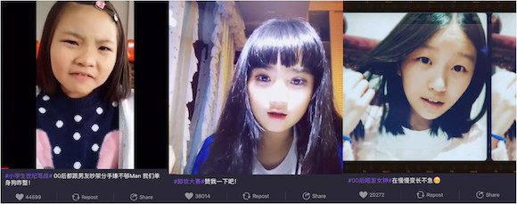 是不是觉得选美大赛的名字很耳熟?实际上,头尾各一个“ # ”号框起来的 00 后各项评比在美拍上多到数不过来。随便报上几个名字,大家就能感受到00后在美拍的活跃度,比如前文提到的# 00 后微笑女神#,还有#00后素颜女神#、# 00 后唱歌大赛#、# 00 后舞蹈大赛#、# 小学生世纪骂战#等等。