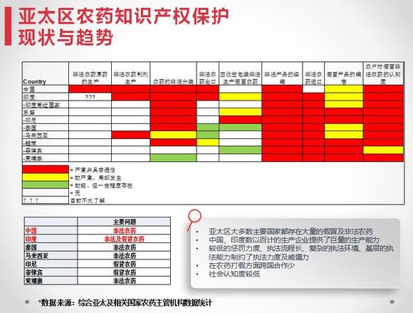 3月14日下午,在杜邦植物保护亚太区品牌保护顾问在司马青云准备的演讲稿中,一张名为亚太地区假冒及非法农药现状的表格格外显眼。