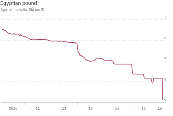 最近几周,埃及镑不断走软。上周,黑市价格达到1美元兑10埃及镑,周末回落至1美元兑9埃及镑左右。埃及央行周一宣布贬值后,黑市上美元兑埃及镑汇率又稍稍有所下降。