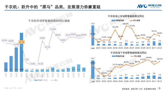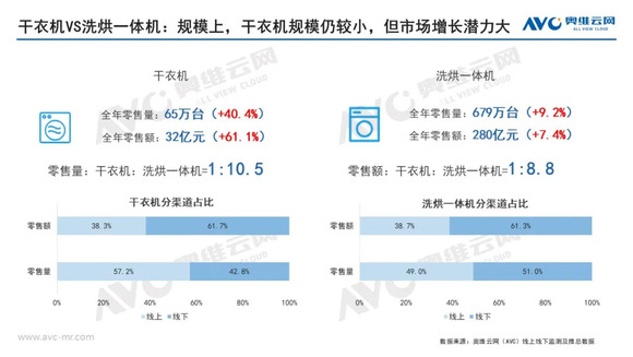 2020年干衣机零售量65万台,零售额32亿元,与洗烘一体机市场差距仍然较大。