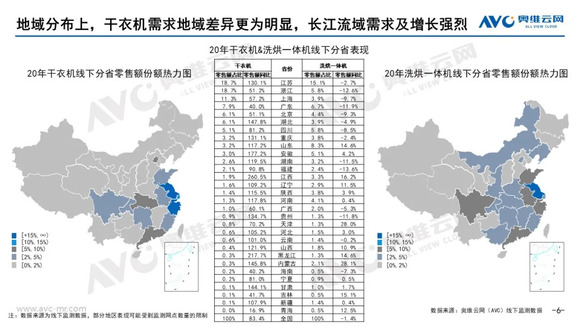 再次,在地域分布上,干衣机需求地域差异更为明显,东南沿海及长江流域需求及增长强烈;而洗烘一体机的地域分布更为广泛与多样,同时,在江苏、广州、浙江等地,干衣机和洗烘一体机的竞争尤为激烈。