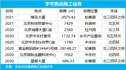 不完全信息显示,2020年至今,字节跳动经常在北三环、北四环附近寻觅合适的办公楼,先后租下盈都大厦、紫金数码园、中关村e世界、城建大厦、唯实大厦等部分空置面积,扩租面积约5.2万平方米。此轮扩租的最远办公地点在北五环之外——中关村壹号,隶属海淀北部永丰产业基地。(以上数据来源北京市住建委)