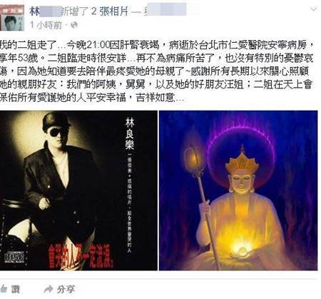 根据台湾媒体报道,53岁的女歌手林良乐因肝肾衰竭于昨晚9点在台北市仁爱医院安宁病房去世。1984年出道的她,以一身中性打扮走红乐坛,长发加上墨镜的招牌造型,歌声轻柔嘹亮,与《我想有个家》的歌手潘美辰齐名。著名歌曲有《冷井情深》、《温柔的慈悲》、《会哭的人不一定流泪》等。