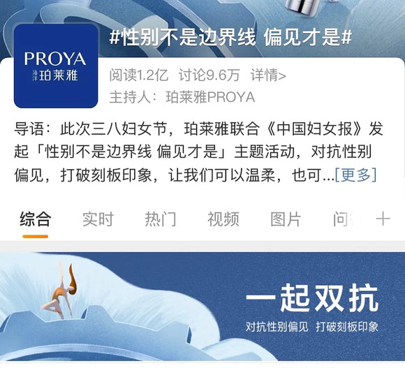 三八国际妇女节前夕,一个#性别不是边界线 偏见才是#的话题登上微博热搜榜,截至发稿前,该话题已引发1.2亿的阅读,讨论量突破9.6万次。而这一话题正是由国内头部美妆企业珀莱雅基于对“性别偏见”的细致洞察,对“性别平等”的深度思考,联合《中国妇女报》共同发起的。