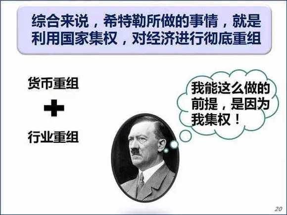 希特勒上台之后最重要的一个贡献,就是在短期内迅速恢复了德国经济的元气。他的做法综合起来说,就是利用国家集权,通过货币重组和行业重组,实现了对经济的彻底重组。