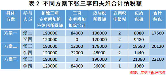 可以看到,在不同的申报情况下,张三夫妻二人分别适用不同的税率等级,也由此产生了不同的应纳税额。其中,方案三纳税最多,比方案二多纳税2040元,比方案一多纳税4600元。