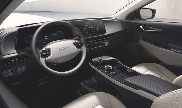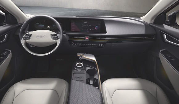 E-GMP平台的平坦地板和全新的简约内饰设计理念意味着EV6的车厢比起亚现有的电动车更加宽敞。倾斜的仪表盘和纤细轻巧的座椅设计被用于最大限度地减少对乘员空间的侵入。与现代汽车的同门师兄一样,EV6的内饰全部使用了再生塑料。