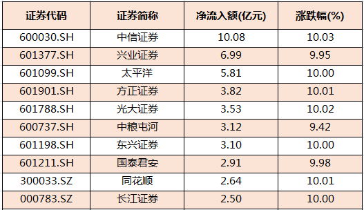在21日十大资金净流入个股中,券商股十分惹眼,占据7席。中信证券(600030.SH)、兴业证券(601377.SH)和太平洋(601099.SH)当日净流入额居前三,分别为10.08亿元、6.99亿元、5.81亿元。其中,中信证券更是遭11.40亿元的主力抢筹,兴业证券则以5.86亿元的主力净流入额位列个股第二。